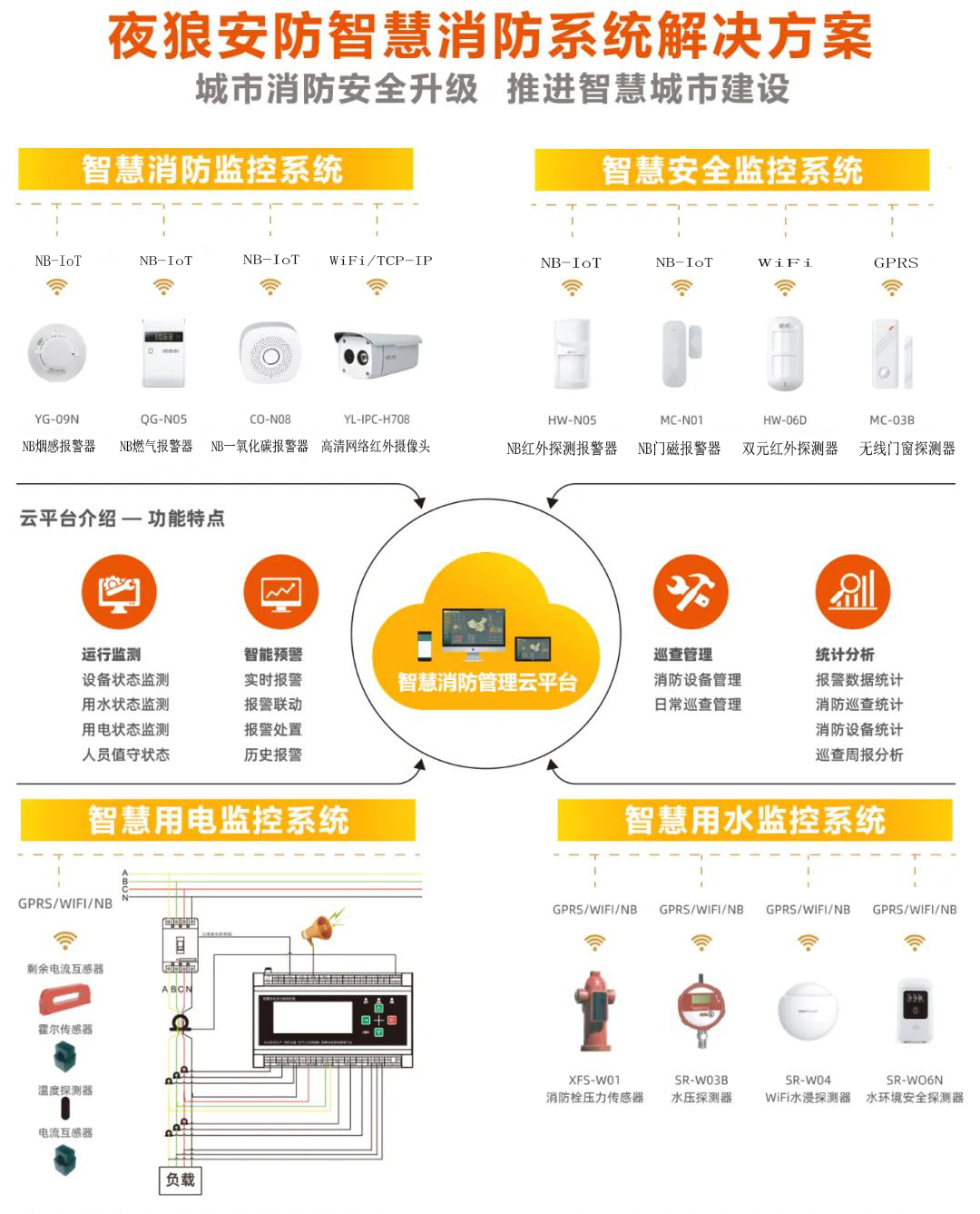 针对“九小场所”的特点,建立由感烟器-可燃气体监测器-防漏电监测器-报警按钮4款设备组合而成的消防环境监测报警系统,内嵌NB-loT物联网模块,使设备具备通讯上报能力,支持火灾环境监测、异常上报、火灾报警等功能。