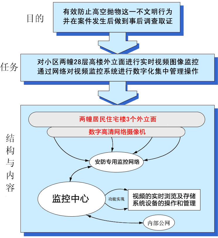 根据本次系统建设的框架和建设的思路,本次视频监控系统建设覆盖小区内两幢28层高的居民住宅楼,覆盖两幢大楼的歌3个能够发生高空抛物的监控面。建成后的智能高清视频监控系统将能够对住宅楼外立面进行实时监控及分析,形成统一的监控网络,实现对大楼高空抛物事件的重点监管。我们规划建设一套完整的数字化、高清化的视频监控系统,利用当今成熟的数字视频压缩技术、多媒体技术、光缆传输技术、电视监控技术、网络技术等,构建一套适合于整个项目的高空抛物防控体系。